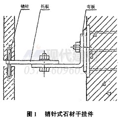 即用銷針和墊板通過板材邊沿開孔連接,見圖1。此種干掛件及方法于二十世紀(jì)八十年代中期從國外引進,為國內(nèi)干掛件獎定了基礎(chǔ),同時也是建設(shè)部行業(yè)標(biāo)準(zhǔn)(JC830一1998)的參照件。此種靠銷針受力,在銷孔處應(yīng)力比較集中。據(jù)已建工程反映,在應(yīng)力集中處石材局部有裂碎現(xiàn)象,在操作中費工、費時、費料等?,F(xiàn)巳逐漸被其他方法代替。