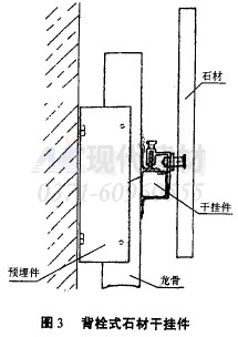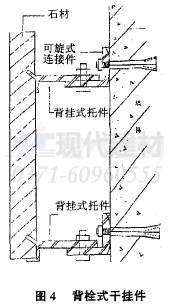 此種掛件由德國引進。施工,見圖3。即在石材的背部打孔用錢栓與龍骨連接,由后切式錨栓及后支持系統(tǒng)組成的幕墻干掛體系,因機械式錨固結(jié)構(gòu),不以柔性結(jié)合,不能解決好因溫差造成的熱脹冷縮變形問題。由于膠枯劑直接決定著錨固件的牢固性能,且操作繁瑣、故機械、錨固結(jié)構(gòu)在借界范圍仲用備不大。