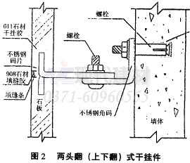 此種掛件其形狀和方法顯得有點笨拙,見圖2,在加工成形時已破壞了掛件強度(優(yōu)質(zhì)不銹鋼除外)。施工中因其上下翻頭厚度和彎度迫使所切溝相必須加寬,安裝時對石材容易造成破損,加工槽寬用膠量過大便其綜合成本加大,便用中略顯技術(shù)落后。對掛件材質(zhì)要求不明確,故不適宜廣泛采用。