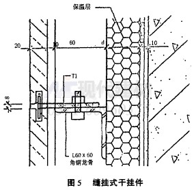 此種掛件以鄭州現(xiàn)代建材服務(wù)有限公司研發(fā)的鋁錢談合金干掛件為代表,見圖5。其材質(zhì)性能與背掛式掛件相同,而其施工方法的優(yōu)勢在于短植支揮,定位切槽,保證整個幕墻的垂直度,與鋸片同半徑的弧形鑲片可緊密固定于溝槽中。該掛件為擠壓成型,強度大,牢固性強,提高了挑展性能。TF件組合可調(diào)整墻體傾斜,保證了飾面的垂直度要求,此施工方法抉速簡便,能夠提高工效,加快施工進度,降低勞動強度,減少用膠量、工時費、板材厚度(1.5-2.5cm)等。大大降低了綜合成本見圖5