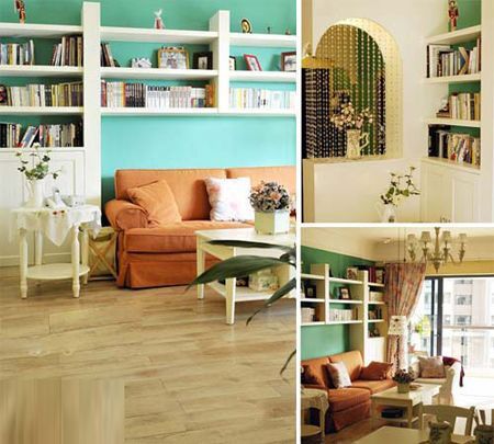 客廳的全貌展示,玄關(guān)處的鏡子裝飾的很別致,精美的馬賽克墻磚,藤藝的收納筐,玄關(guān)柜用珠簾隔斷,隨風(fēng)靈動(dòng)??蛷d也擺放了大量的書籍,書香味彌漫,白色的家具,橙色的沙發(fā),很溫暖。