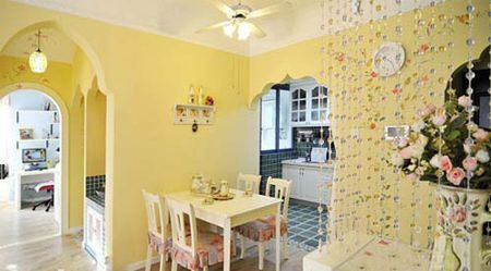 開放式的餐廳節(jié)約了很大的空間,連接了廚房和客廳的視線,背景墻刷成溫馨的淡黃色,感覺很幸福。