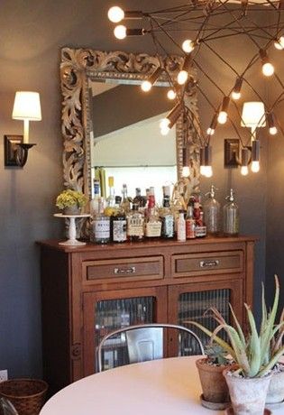 裝飾Tips:銅色邊框的雕花鏡子邊框的帶鏡收納柜,收納各式各樣的酒類,營造吧臺的氛圍。搭配鏡子兩旁的壁燈,在淡黃色燈光的照應(yīng)下,讓吧臺角落更有情調(diào)。