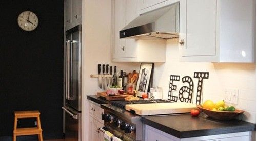 裝飾Tips:廚房以干凈、整潔、收納有序為重點。墻壁上的強力磁鐵讓刀具有序地站立在墻壁。墻壁上“EAT”字眼讓廚房的空間特色更加鮮明。
