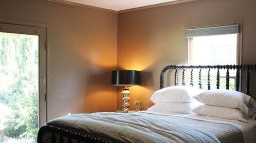 裝飾Tips:大落地玻璃窗讓室內(nèi)的采光范圍更大。簡單的灰白色床上四件套體現(xiàn)簡約的小資味道,搭配墻角黑色燈罩金色臺燈座的格調(diào)臺燈,讓寢室的男性味道更加濃郁。