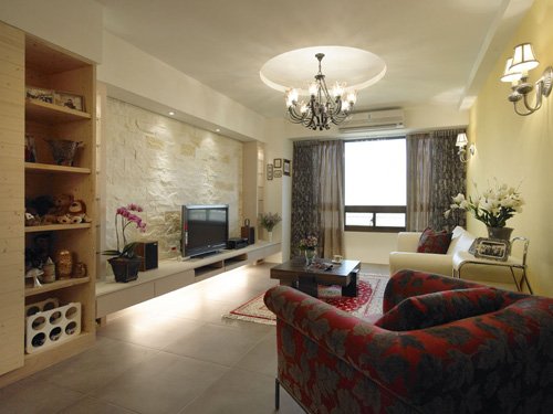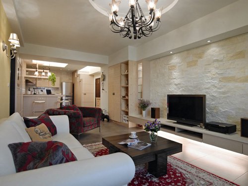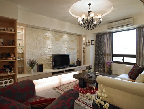 石材鋪陳的電視主墻,懸浮式柜體設(shè)計和緩了視覺重量。