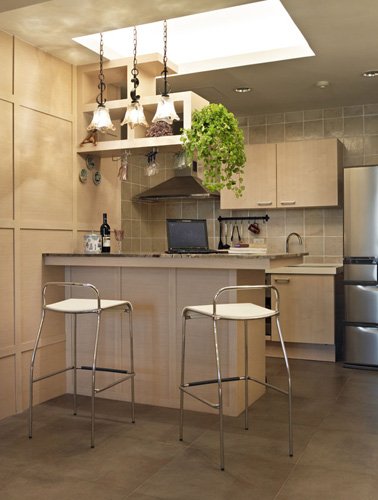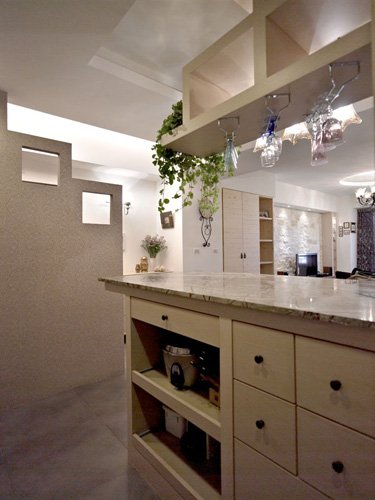 在空間機能的安排,設(shè)計師于懷晴考慮屋主一人居住餐桌實用性較低,因此改以吧臺式設(shè)計。