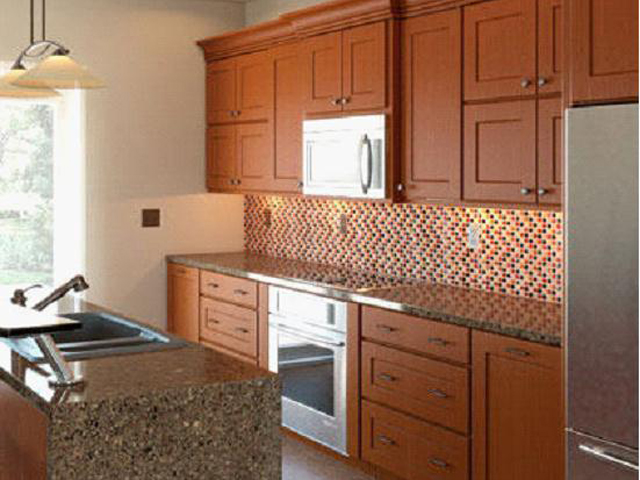 馬賽克裝修效果圖,這種大地色系的櫥柜單看不算突出,但當它遇上紅黑白三色的波浪狀鋪貼的馬賽克時,激情的火花瞬間迸發(fā);整個廚房寬敞明亮,空間安排合理,方便操作;島臺兼顧吧臺的設(shè)計使下廚的時間也不影響家人間的交流;對于崇尚休閑輕松生活的朋友而言這樣的廚房再好不過。