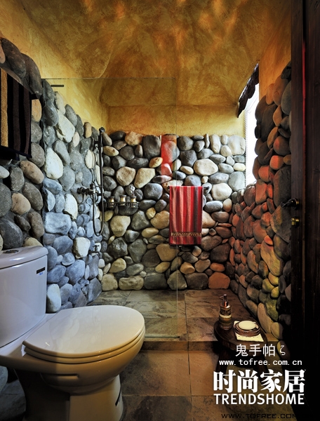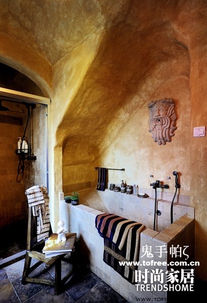 2樓衛(wèi)生間和小孩共用,浴缸部分干脆跨越到上3樓的那部分樓梯底,否則安排下淋浴房及獨立分開的浴缸有點困難,樓梯底的斜面經(jīng)過扭曲變形改變后有點象洞穴,本來不利的空間反倒有趣起來。