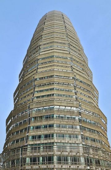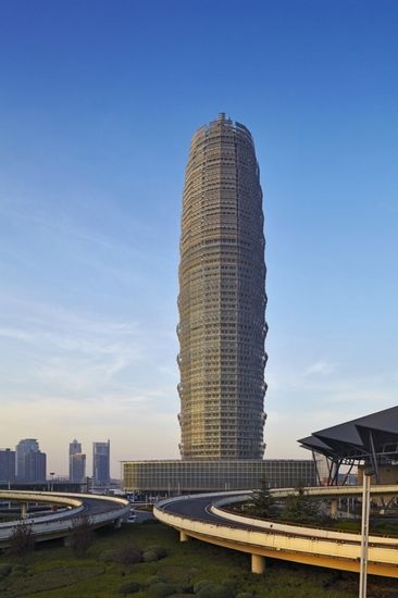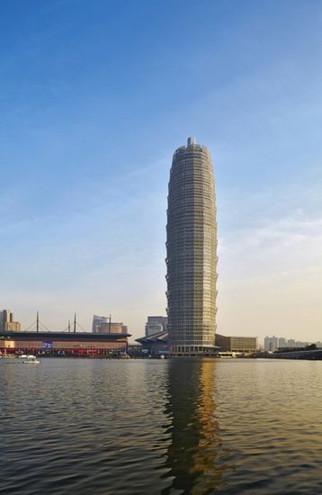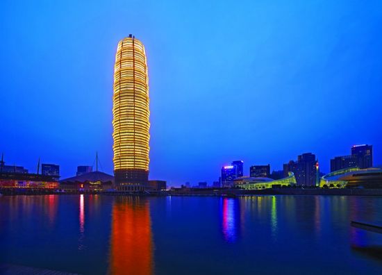 該項(xiàng)目位于鄭州的東北部,約919英尺(280米)高。其建筑面積約2.59萬平方英尺(240169平方米),在較低層設(shè)有混合使用的辦公室而以上是416間的酒店。自然采光的建筑的設(shè)計(jì)是一個(gè)關(guān)鍵的驅(qū)動(dòng)程序。先進(jìn)的三至五層高光片涂鋁的屏幕配置向外傾斜,增強(qiáng)室內(nèi)采光,通過科學(xué)計(jì)算的反射,同時(shí)保護(hù)全玻璃外墻,太陽能增益。人工照明,提供了外側(cè)的位置,建筑引人注目的夜間照明,使塔樓看上去就像一盞明燈。