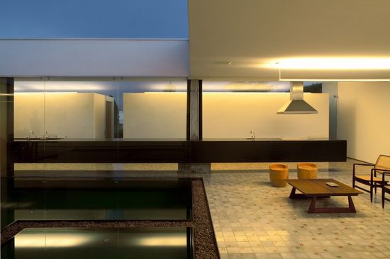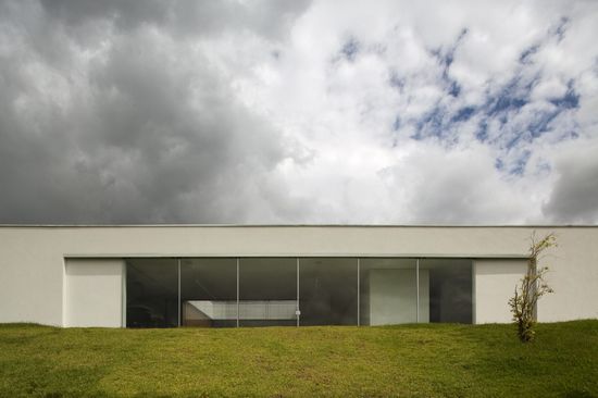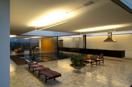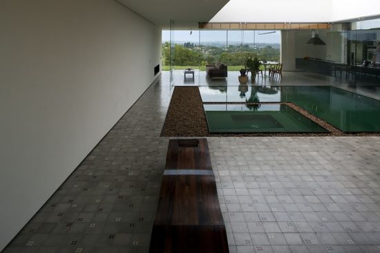 Sao Roque住宅以兩個(gè)約束條件為基礎(chǔ):它充分利用南部平均20%的坡度,建成一個(gè)單層的住宅。院子、地板和水都應(yīng)該位于相同的水平面。該結(jié)構(gòu)以間隔12米的兩大支柱為基礎(chǔ),在中心支撐著一個(gè)90厘米高的梁,然后向兩端逐漸減少的20厘米高,其每個(gè)4米長的懸臂都超出了支柱。