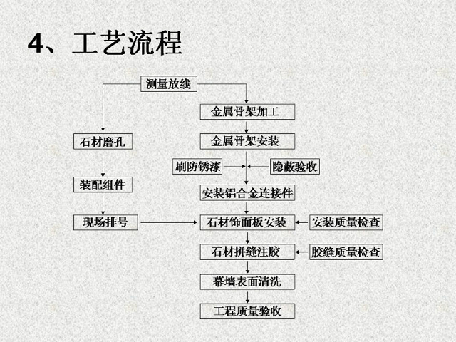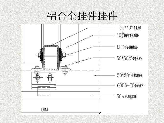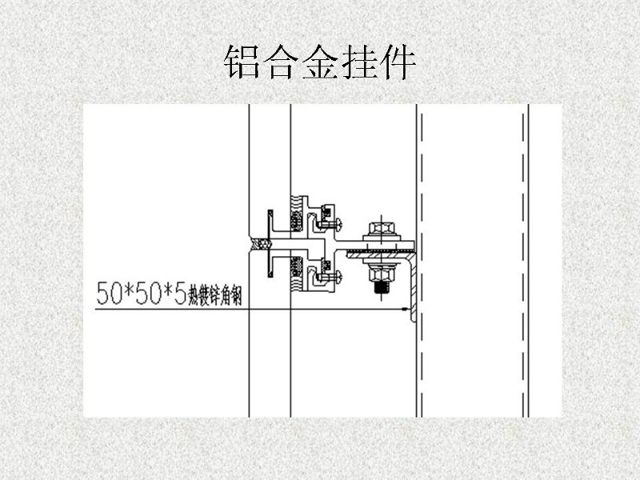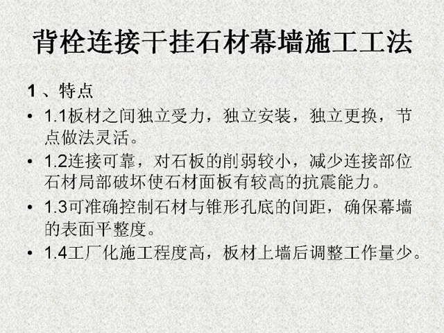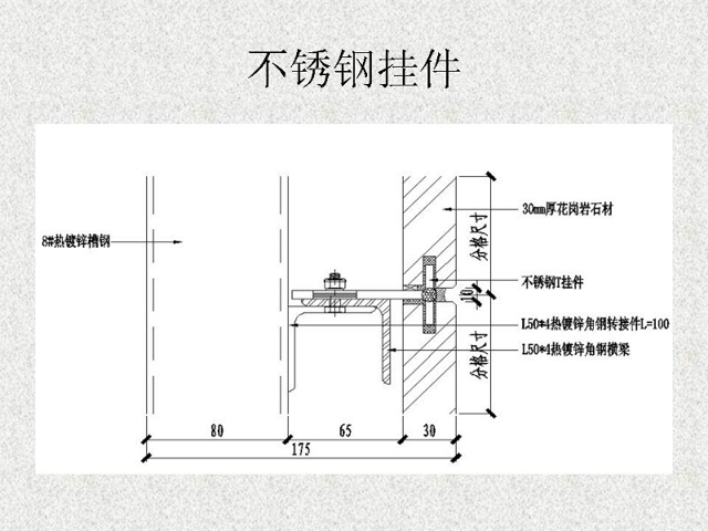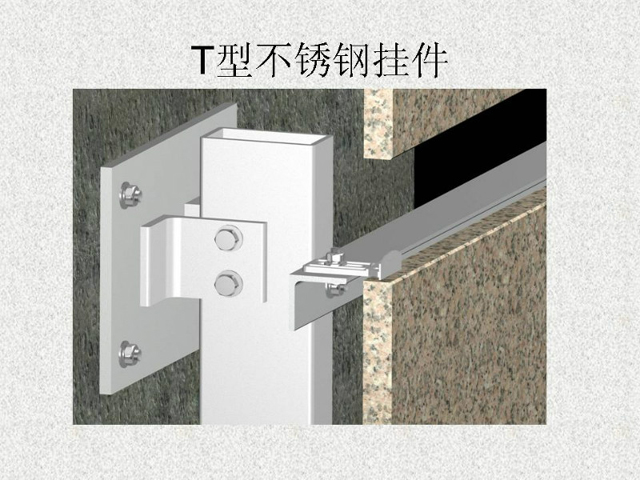 石材干掛法又名空掛法。是當(dāng)代飾面飾材裝修中一種新型的施工工藝。該方法以金屬掛件將飾面石材直接吊掛于墻面或空掛于鋼架之上,不需再灌漿粘貼。其原理是在主體結(jié)構(gòu)上設(shè)主要受力點(diǎn),通過金屬掛件將石材固定在建筑物上,形成石材裝飾幕墻。