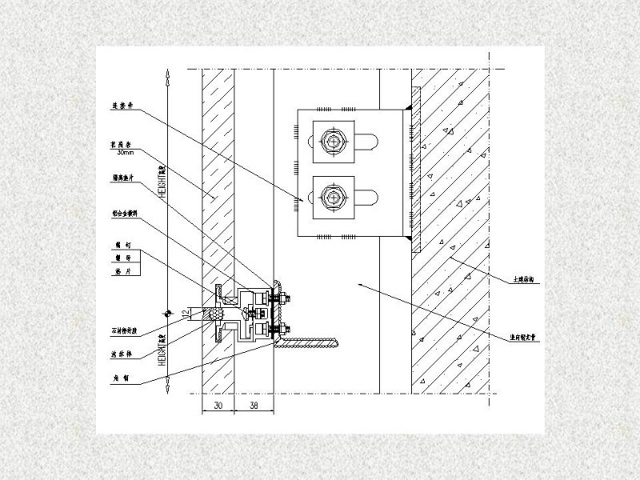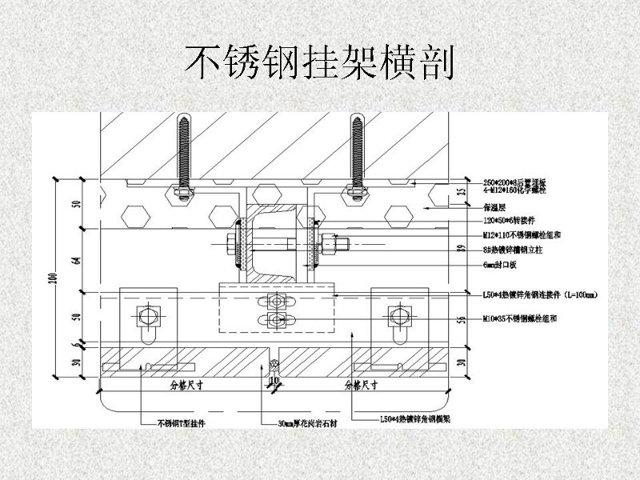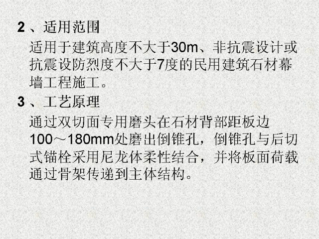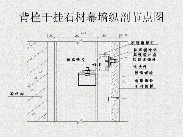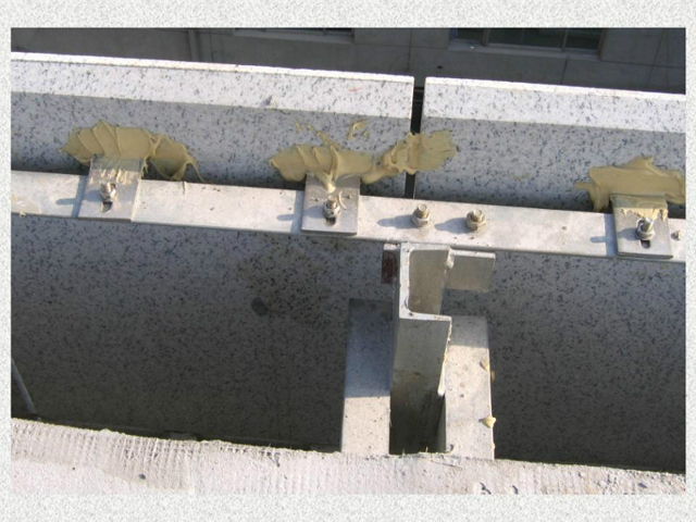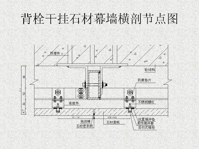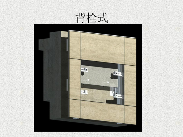 干掛石材是建筑外墻的一種施工工藝,該工藝是利用耐腐蝕的螺栓和耐腐蝕的柔性連接件,將大理石、花崗石,人造大理石等飾面石材直接掛在建筑結(jié)構(gòu)的外表面,石材與結(jié)構(gòu)之間留出 40~50mm 的空腔。用此工藝做成的飾面,在風(fēng)力和地震力的作用下允許產(chǎn)生適量的變位,以吸收部分風(fēng)力和地震力,而不致出現(xiàn)裂紋和脫落。當(dāng)風(fēng)力地震力消失后,石材也隨結(jié)構(gòu)而復(fù)位。