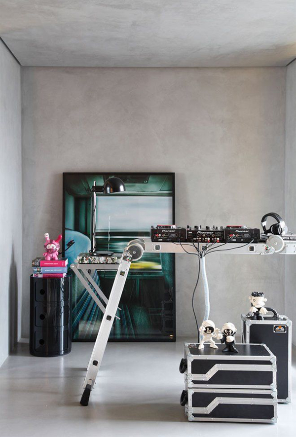 房間中到處是有趣的家具,比如由鋁制梯子改造而成的 DJ 工作臺,限速牌制成的凳子,還有那只大鐵桶??蛷d中沒有太多雜亂空間,蓬松柔軟的地毯讓空間顯得非常溫暖,來自德國設(shè)計師 Konstantin Grcic 的 CHAIR ONE 完美的配合整體設(shè)計風(fēng)格。
