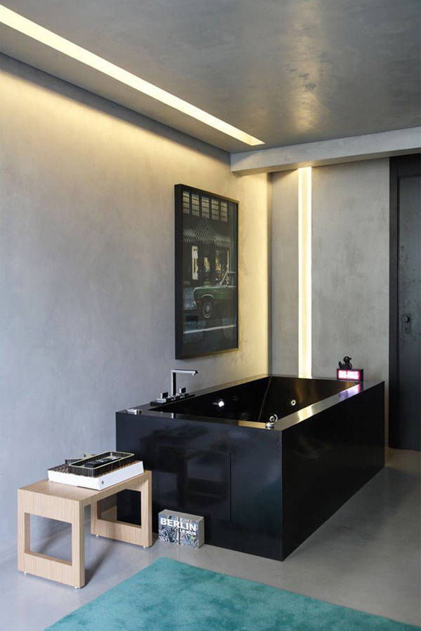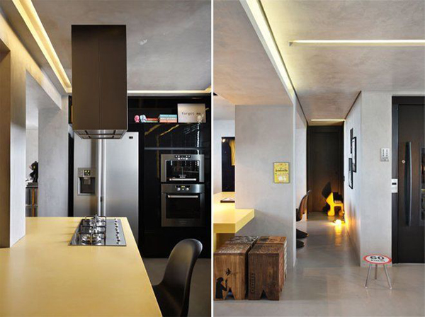 Studio Guilherme Torres 創(chuàng)造了一種極具戲劇效果的照明環(huán)境,高亮度低能耗的暖色 LED 光源設(shè)置在遍布房間各處的凹槽中,給冰冷的水泥墻壁和天花增加了一絲暖意。廚房中明黃與黑色的搭配更彰顯時尚。