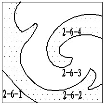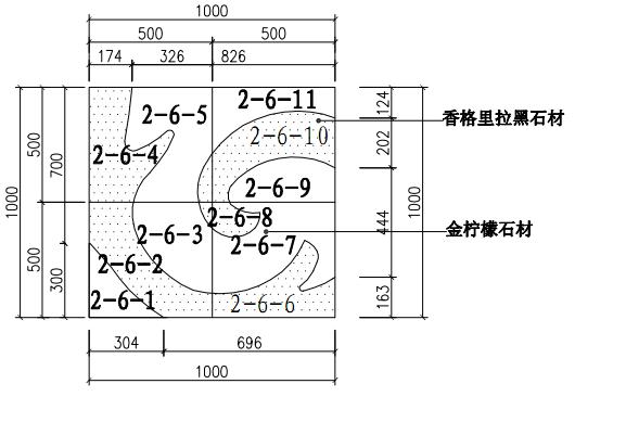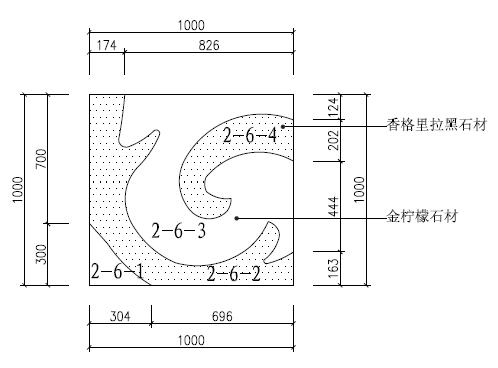 (1)、水刀設(shè)備切割機(jī)將完成好的1000×1000的香格里拉黑石材切割成2-6-2、2-6-4的形狀,同樣的操作將完成好的1000×1000的金檸檬石材切割成2-6-1、2-6-3的形狀,此時(shí)工廠得到2-7部分石材的4個(gè)組合板塊。