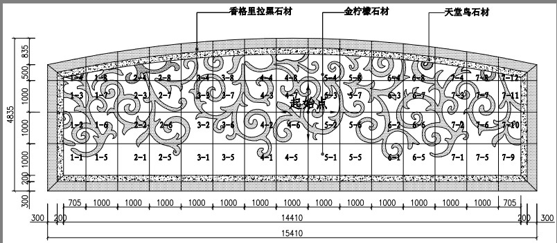 起鋪點確定原則:盡可能的將石材的起鋪點確定在施工區(qū)域的中心,以便將非整塊石材消化在墻腳等隱蔽部位。