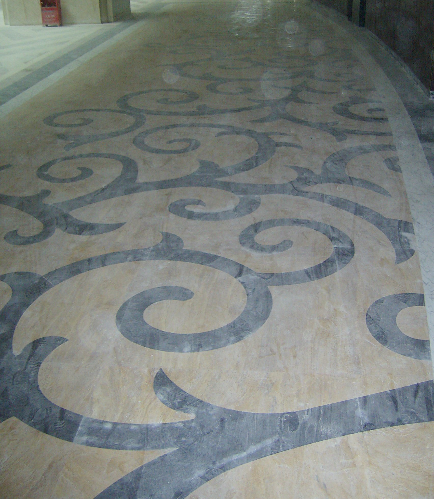 施工流程:放線→試拼→鋪拼花石材→勾縫、打磨→打蠟拋光→成品保護(hù).