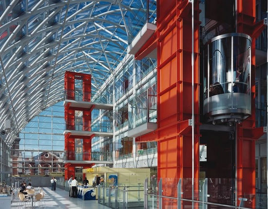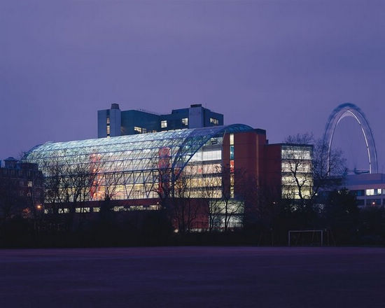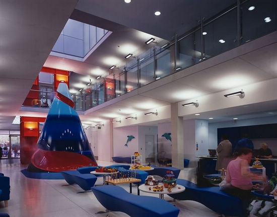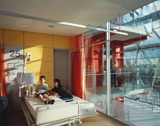 在這個(gè)項(xiàng)目,辦公空間的設(shè)計(jì)理念得到了應(yīng)用。跟辦公樓一樣,醫(yī)院要求高效率的有彈性的布局,并有休閑社交互動(dòng)空間。在艾維利娜兒童醫(yī)院,我們打破了狹長(zhǎng)走廊和乏味病房的典型布局。設(shè)計(jì)的建筑剖面非常簡(jiǎn)單,包含兩個(gè)長(zhǎng)體塊和體塊之間的中央大廳,大廳與整個(gè)建筑通高。建筑較低的三層共享重癥監(jiān)護(hù)室、3個(gè)手術(shù)室、影像設(shè)備和門診部等功能。以上三層是病房,可俯瞰一個(gè)寬敞的溫棚。溫棚在一個(gè)巨大的彎曲的玻璃頂之下。