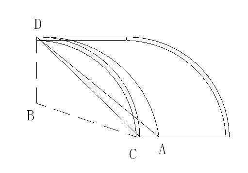 圖中DB、BC為弦長;CD為弧板弦長,AD為斜切后弦長,CA為弧板順高度切除的最大尺寸。可見:<CDA就是以弧板底面定位時的工作臺轉(zhuǎn)角α,<FCE為扳刀角β: