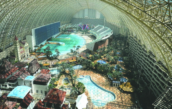 高約100米,長近500米,寬約400米的新世紀(jì)環(huán)球中心建筑主體中擁有目前世界上最大室內(nèi)人造海洋樂園。
