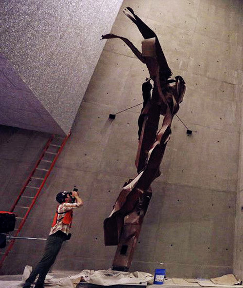而最令人心生寒意的部分便是一段受損扭曲的樓梯,這段當(dāng)年幫助數(shù)百美國人成功逃出的“生還者樓梯”會在自動(dòng)扶梯和參觀樓梯之間展出。紀(jì)念博物館總監(jiān)愛麗絲·格林沃爾德(Alice Greenwald)說:“參觀者在此重走當(dāng)年9·11幸存者的逃生之路。我們現(xiàn)在生活在劫后余生的世界里,因此,在某種程度上說,我們都是9·11事件的幸存者。”館內(nèi)還有其他一些被塑料薄膜包裹著的遺物,如:旗狀的鋼材,T型鋼材,還有著名的“鋼梁十字架”等。