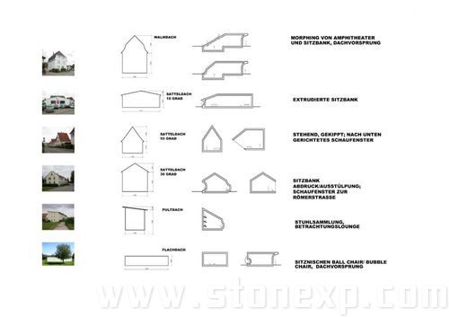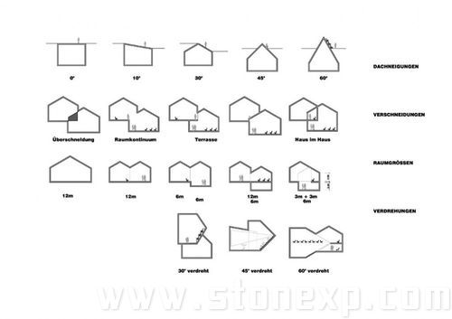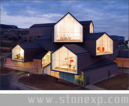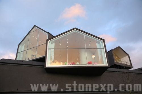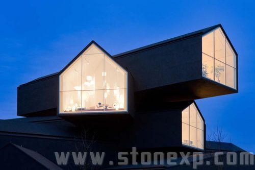 VitraHaus的設(shè)計概念包含了兩個一直出現(xiàn)在Herzog & de Meuron作品中的主題:原型房子和堆積體量。以“堆疊”,“擠出”,“壓縮”工業(yè)化生產(chǎn)般的手法來處理住宅的復(fù)雜空間使用。在Weil am Rhein的這個項目中,這個概念更強(qiáng)烈地回到了ur-house(原型屋)的主題,而且這個5層建筑的主要目的就是展示為家庭設(shè)計的家具和器物。根據(jù)室內(nèi)空間的性質(zhì)和尺度,這個建筑采用了“家居尺度”這個母題,這樣設(shè)計的展廳能夠暗示出熟悉的家居環(huán)境體驗。每個獨(dú)立的模塊房子都是相同且抽象的,除了少數(shù)幾個例外。這些模塊房子只有山墻面是采光的,側(cè)墻像是機(jī)械沖床處理的外觀效果。它們像積木一樣堆積起這座5層樓,在有些部分,壯觀的懸挑了49英尺。這些房子初來起來一片混亂,它們在空間中創(chuàng)造了獨(dú)特的3維體驗。