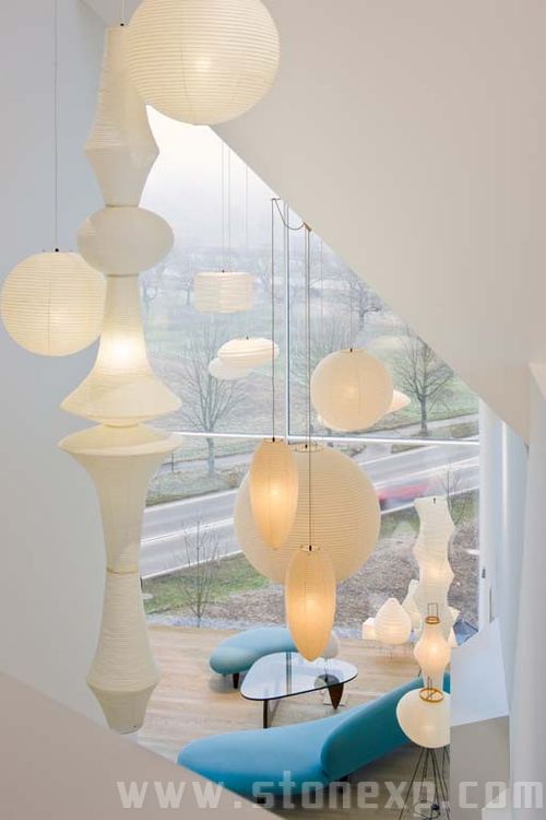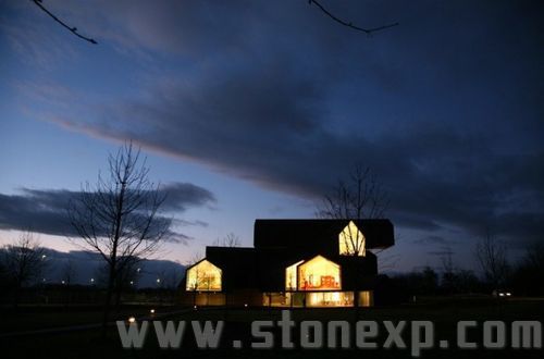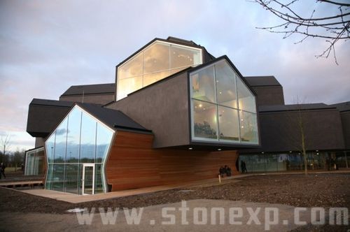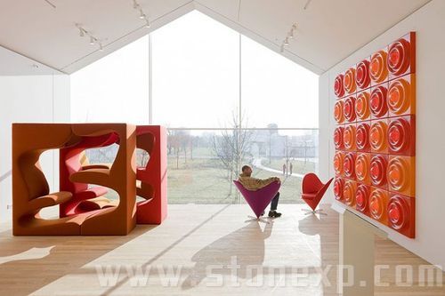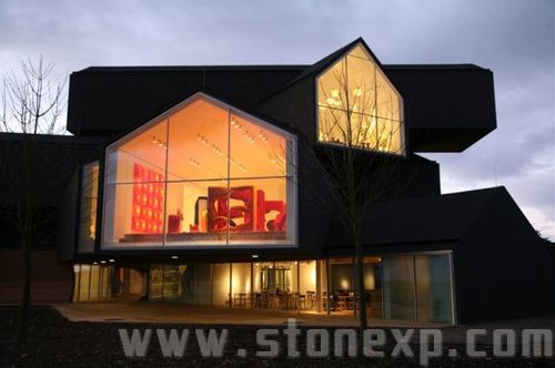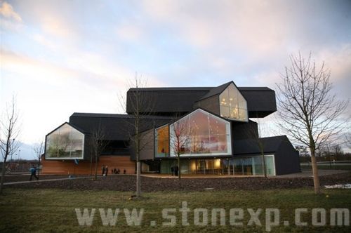 這些房子外墻涂上了炭色的stucco涂料,使得這個結(jié)構(gòu)和大地更親切些,和周邊的環(huán)境也保持了聯(lián)系。它像是一個微型的垂直城市,VitraHaus展館成為這個園區(qū)的標(biāo)志。一片木地板區(qū)域標(biāo)識出中心的開放區(qū)域,圍繞它的是5個功能區(qū)域:會議區(qū),椅子的展示區(qū),Vitra設(shè)計博物館商店,帶接待室和盥洗室的前廳,以及一間咖啡廳。參觀者可以坐電梯直達(dá)4樓,從那里開始回轉(zhuǎn)向下一路參觀。當(dāng)走出電梯時,透過房間北端的玻璃窗,可以看到Tüllinger山壯美的景色。當(dāng)參觀者在房子里面活動時,它們會感覺到空間的豐富和隨意,而實際上,這些方位都是根據(jù)周邊的景色來確定的。