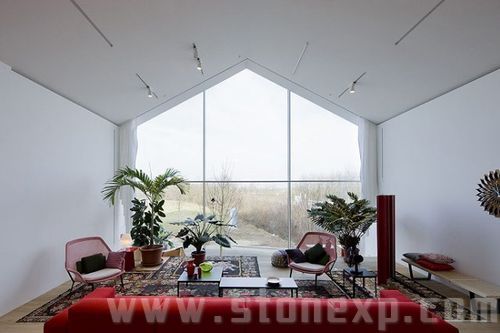 室內(nèi)的復(fù)雜變化不僅僅來自這個獨(dú)立模塊之間有角度的穿插組合,而且還因為這其中還包含另外一套幾何概念。所有的樓梯都經(jīng)過整合,在這些模塊房子的內(nèi)部創(chuàng)造出一條連接上下的蜿蜒變化的通道來,就像孔洞一樣,有時候它看起來很迷人,有時候它提供了另外一個視野。室內(nèi)的墻面涂成白色,這樣更方便家具的展示。