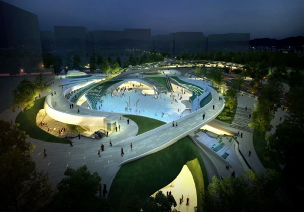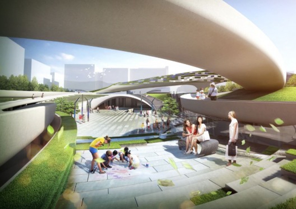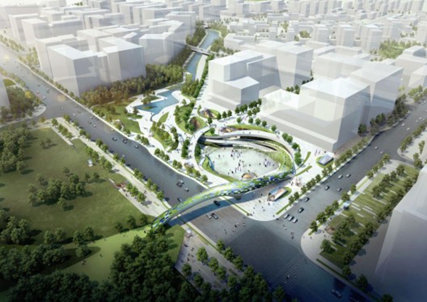 Wooridongin建筑事務(wù)所在首爾麻谷市里設(shè)計(jì)了一座中央廣場,位于Festival大街上。這個(gè)中央廣場是一個(gè)交通樞紐,連接著地鐵5號(hào)線、9號(hào)線和仁川國際機(jī)場。麻古中央廣場接近漢江綠化中心和生態(tài)河流,因此,它又連接著軍港公園和綠地。