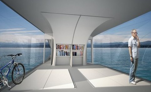 在可移動(dòng)式太陽能水上漂浮住房里可擺放書架,自行車等
