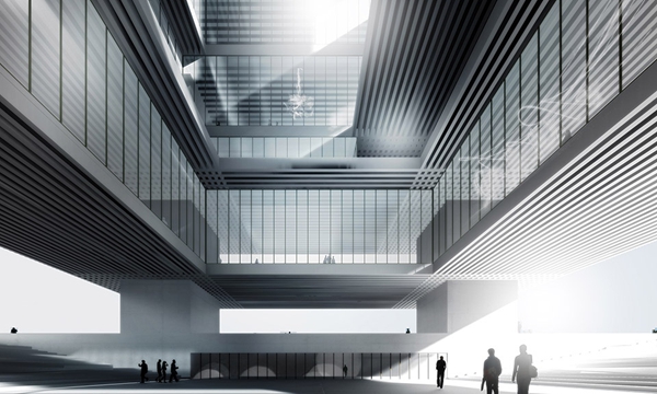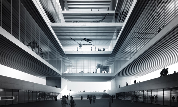 柏林科學(xué)博物館項(xiàng)目主要分為兩個(gè)部分—連接城市的概念性公共空間和建筑內(nèi)部的展示空間。用地建設(shè)計(jì)完成后會(huì)形成一個(gè)連接大學(xué)城、火車站和動(dòng)物園的公共區(qū)域,其上方將漂浮著一個(gè)展覽立方體。參觀者從地下入口進(jìn)入博物館,這片綠色空地中心是博物館的中庭。