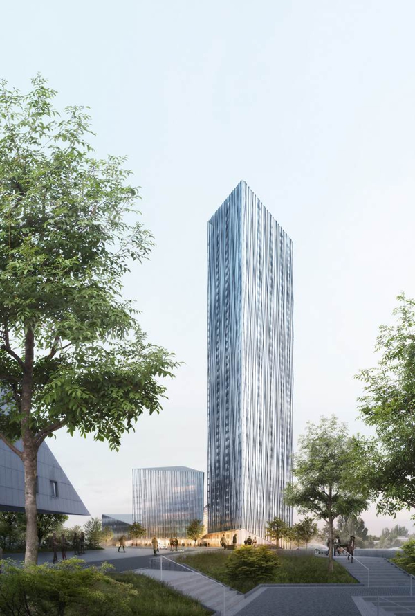 項(xiàng)目不受市中心歷史因素的限制,所有設(shè)計(jì)因素圍繞大樓傾斜的輪廓展開,屋頂露臺(tái)朝向城市。為了呼應(yīng)現(xiàn)有的Estrel酒店,參考兒童游戲“七巧板”,項(xiàng)目采取了一系列大小、高低不一的三角形體量擠壓組合的設(shè)計(jì),使大樓融入周邊的低層建筑群。