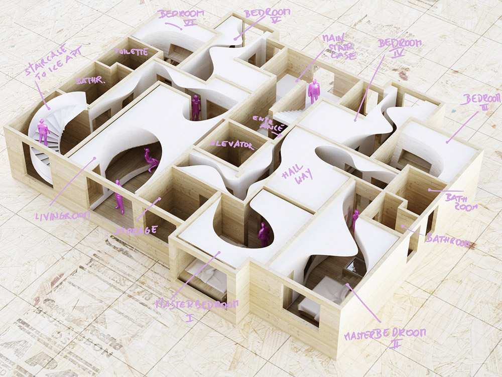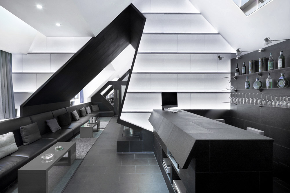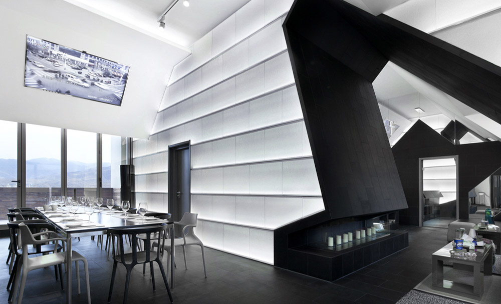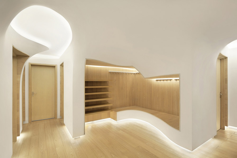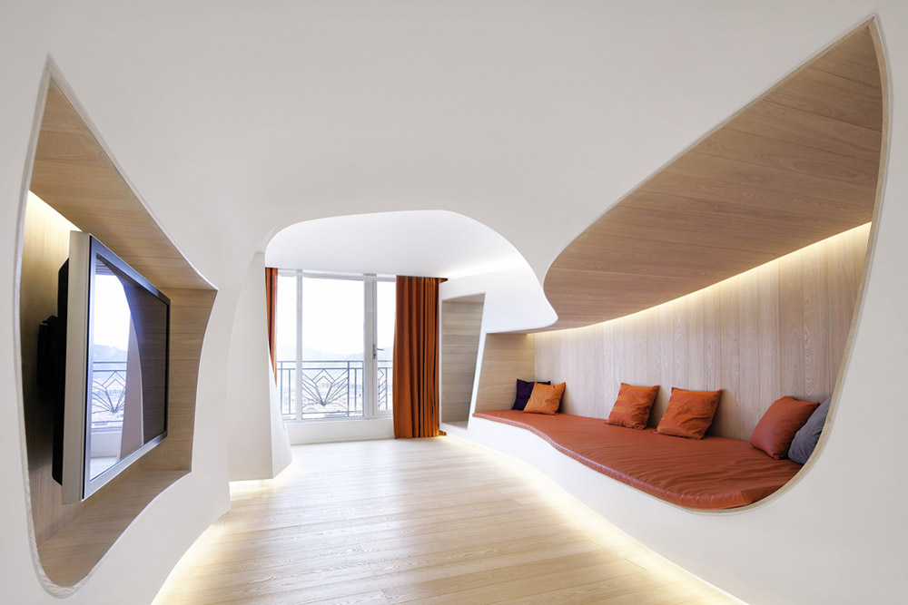 “雪屋”的設計中設計師從融化的雪的形態(tài)中找到靈感,將自然優(yōu)美的曲線應用于室內(nèi)空間形態(tài)設計中,白色的曲面把墻面和頂面聯(lián)系成一個整體,