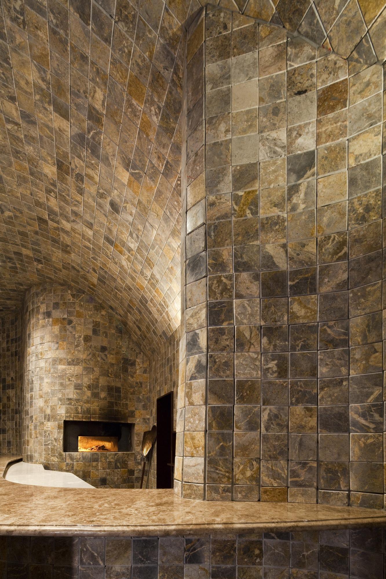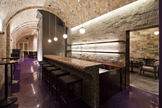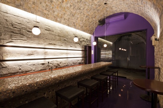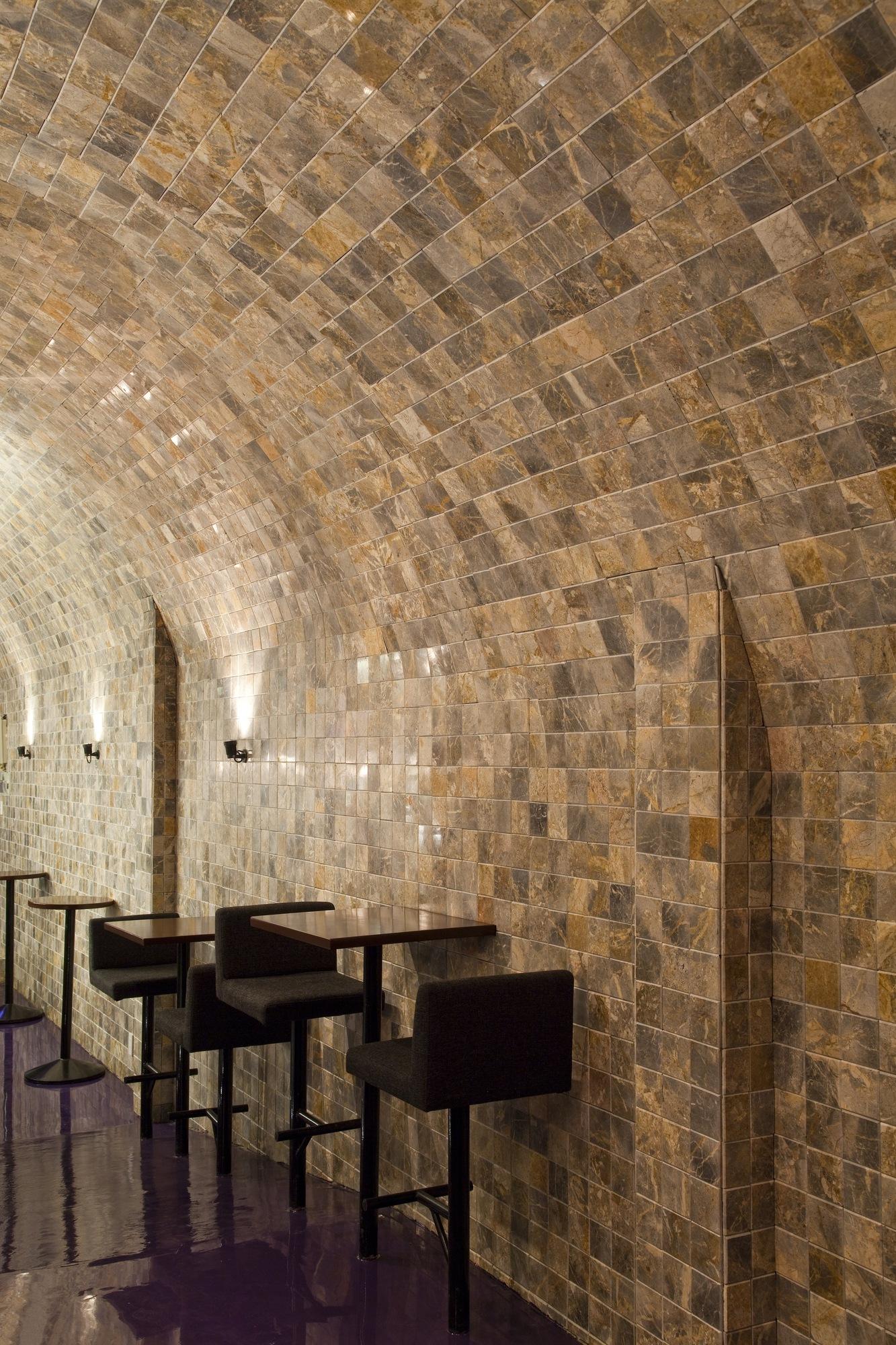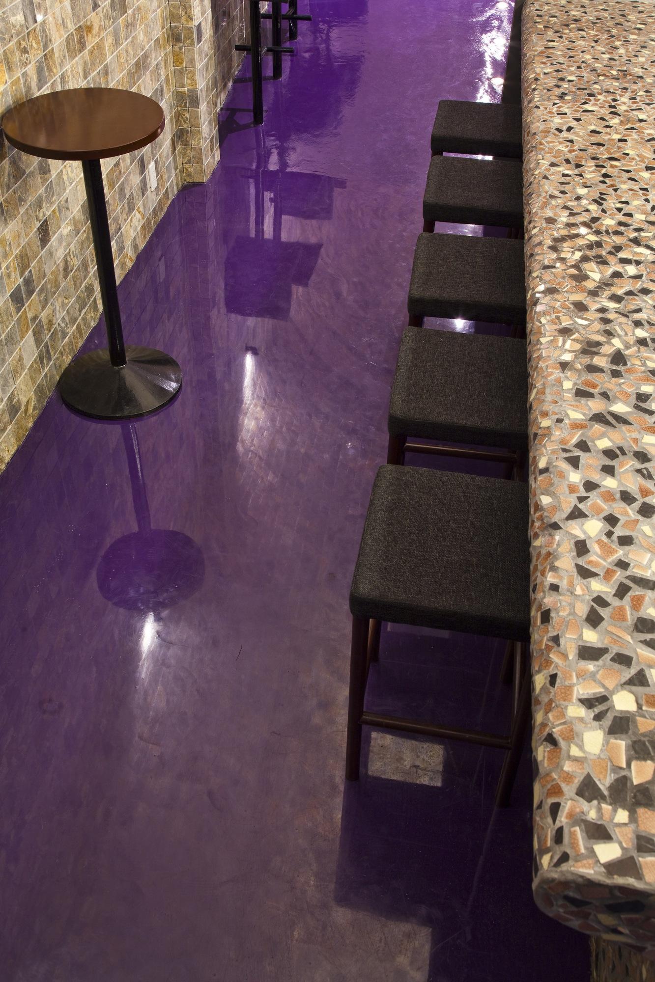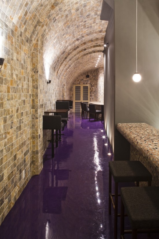 空間的主要組成部分是拱形天花板,墻壁跟天花板連成一體,大理石覆面。紫色的地板,是這家餐廳的象征顏色,吧臺(tái)表面是馬賽克材質(zhì)。