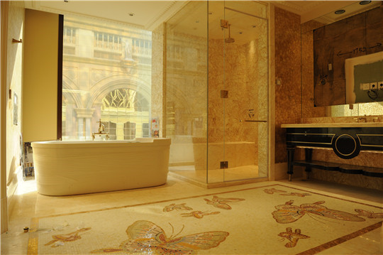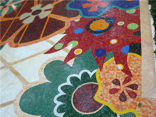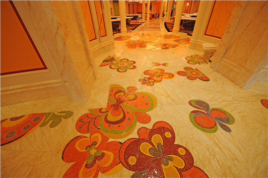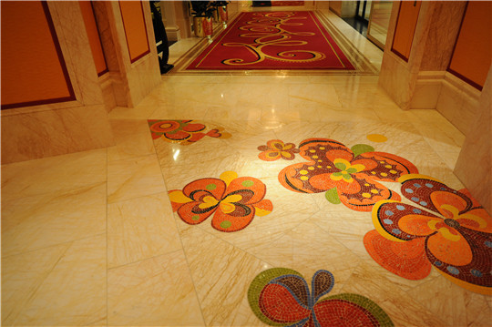 1、永利酒店的地面裝飾設(shè)計(jì)采用了馬賽克裝飾。先將不同顏色的石材分割成不同形狀的馬賽克小顆粒,并依照設(shè)計(jì)圖紙進(jìn)行拼接,色彩與形狀錯落有序的層疊開來,似一只只飛舞的蝴蝶綻放在金蜘蛛的海洋里。