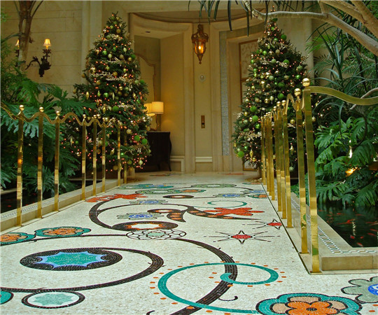 2、美國拉斯維加斯WYNN酒店,是全世界造價最貴的復(fù)合式度假酒店。其中地面的馬賽克拼花設(shè)計(jì)是酒店的一大亮點(diǎn),繽紛多彩的石材顏色搭配出絢麗的圖案,為酒店增添了濃厚的浪漫色彩。