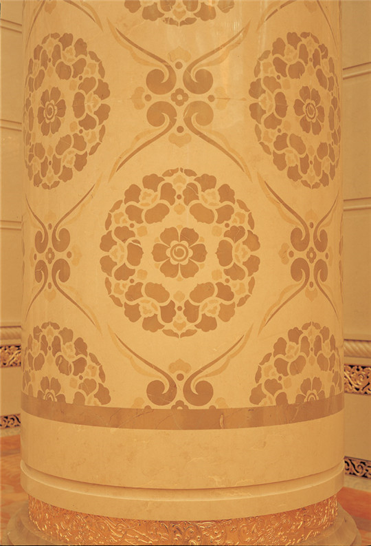 4、環(huán)球石材集團(tuán)經(jīng)過反復(fù)研究,突破了水刀拼花圓柱的工藝制作難題,使拼花由平面拼花發(fā)展到立體拼花,開創(chuàng)了水刀拼花圓柱工藝的先河。其中有8條芙蓉花水刀拼花圓柱,一條圓柱拼花零件就達(dá)6250個。