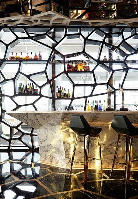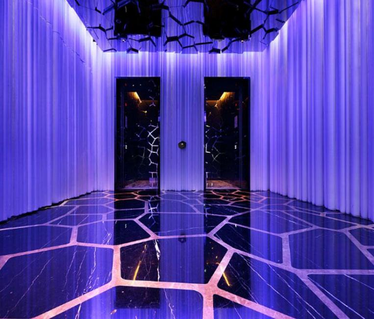 OZONE酒吧豪華的空間裝飾給予了顧客視覺上的精彩享受,地面由黑金色系石材搭配的拼花裝飾,加上燈光的設(shè)計(jì)讓整個(gè)酒吧的空間充滿了神秘。