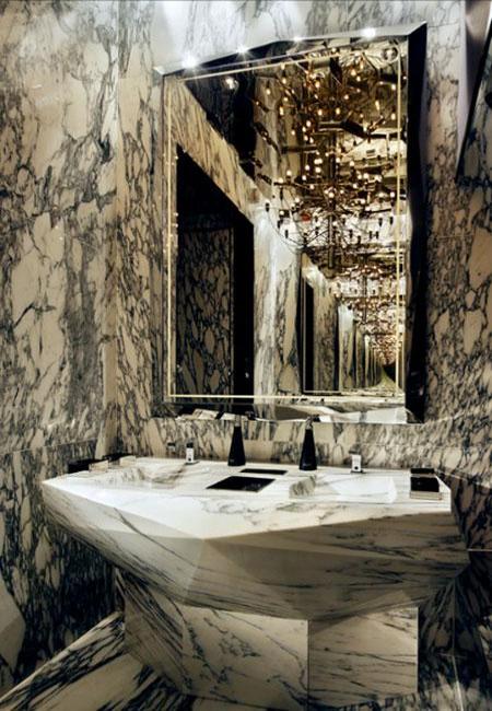 墻面、臺(tái)面及地面都使用了大量的雪花白,使整個(gè)空間都傳達(dá)出奢華時(shí)尚氣息。