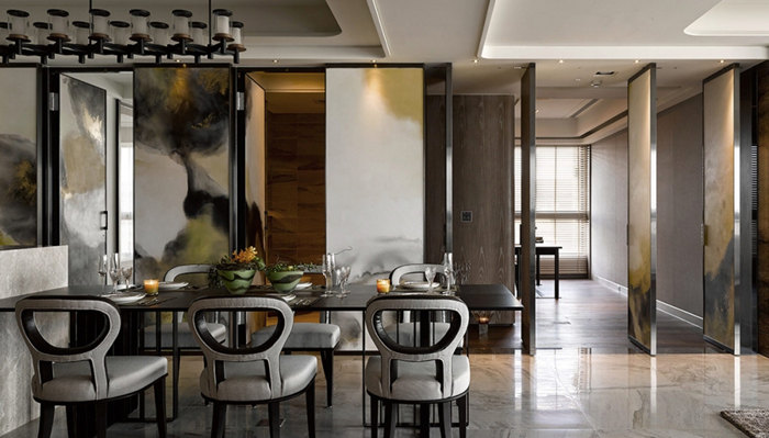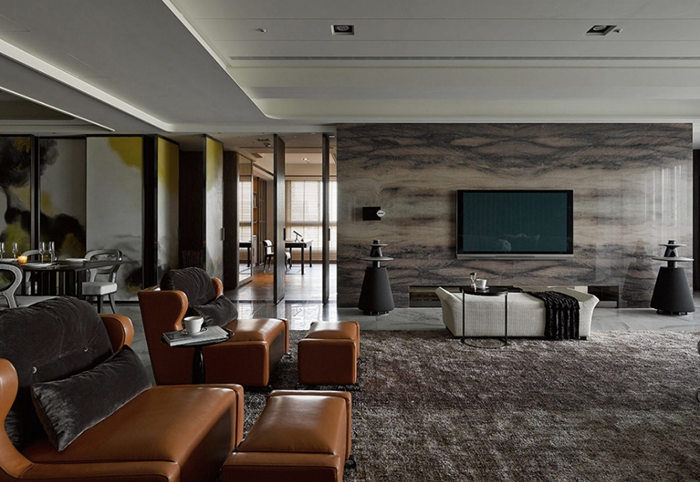 長型的建筑空間,以連續(xù)語匯,串連廳區(qū)的開放尺度?客廳透過寶格麗大理石材的天然紋理,寓意渲染后的山景風(fēng)光,響應(yīng)陽光迤灑而下的磊落態(tài)度,連續(xù)14面活動式推拉門扉,串連書房、客、餐廳等區(qū)域,挹注豐富的人文溫度。