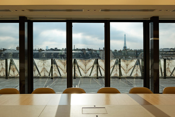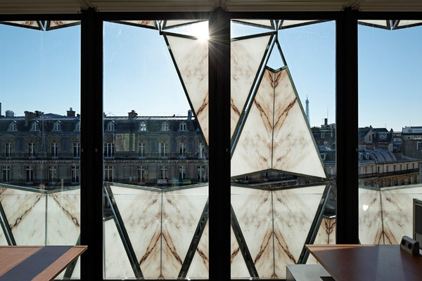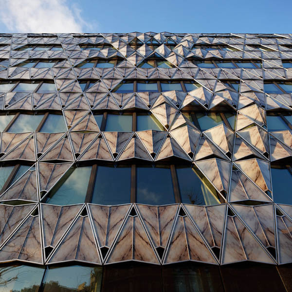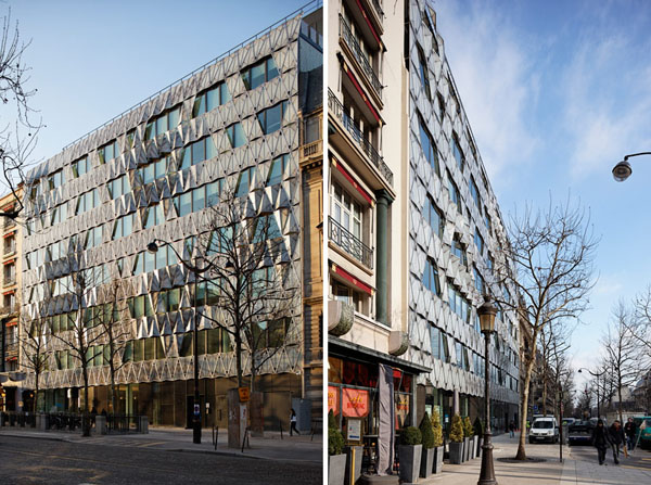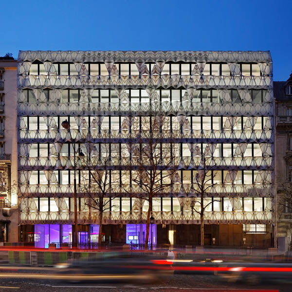 浪漫的香榭麗舍大街,偉岸的凱旋門(mén),而就在這樣一個(gè)散發(fā)著古典氣息的街區(qū),極富視覺(jué)沖擊力的“折紙大樓(Origami Building)”便坐落于此,大理石效果的外墻下是巴克萊銀行(Barclays)設(shè)在巴黎的總部辦公室。建筑師 Manuelle Gautrand 引入棱角分明“折紙”元素:以三角形的大理石板,在臨街立面搭建起外墻裝飾,讓原本厚重的大理石如折紙般輕盈。