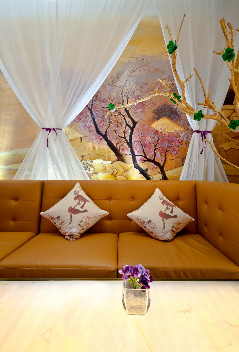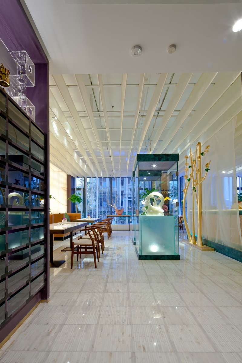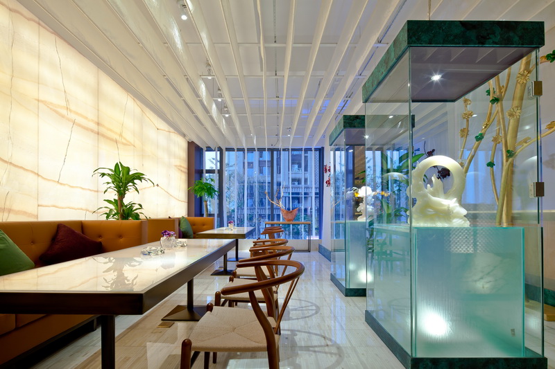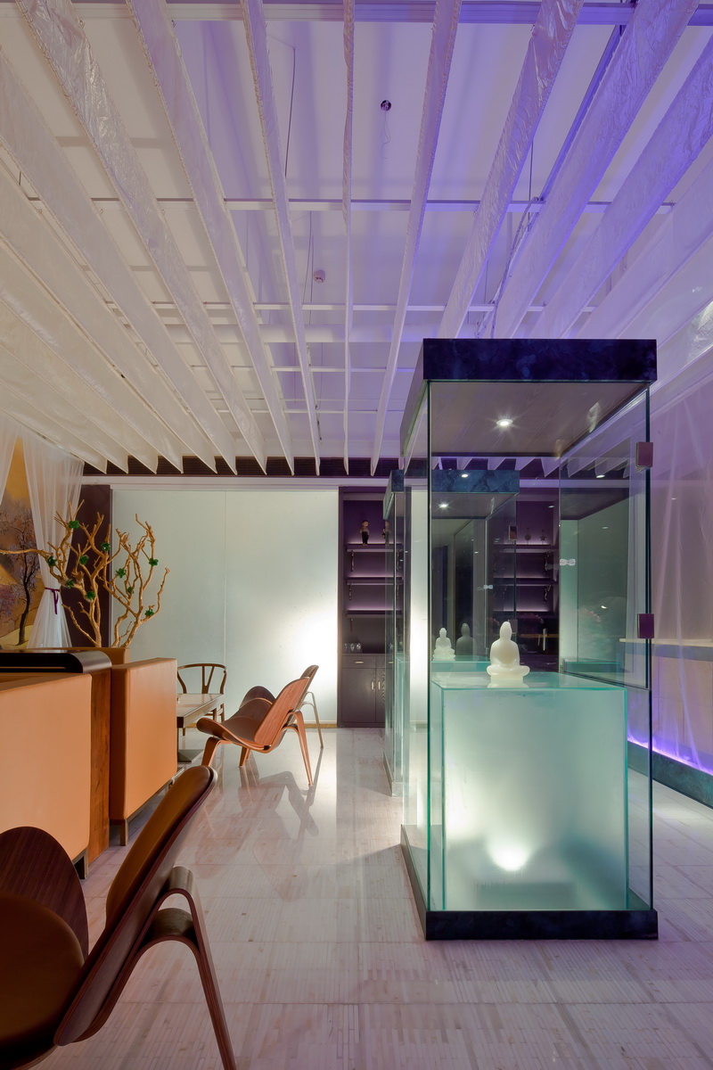 該空間主料以玉石材料和絲綢為主,玉為硬,絲綢為軟;玉則冷,絲綢則暖;輔以青銅的古樸質(zhì)感,以LED光源產(chǎn)生持續(xù)的靈動(dòng)的變化,來烘托整個(gè)空間氛圍,并充分表達(dá)玉的“透”與“潤”、絲綢的“飄逸”與“朦朧”,青銅的“穩(wěn)重”與“貴氣”,最終形成一個(gè)富有當(dāng)代東方文化特質(zhì)的空間。