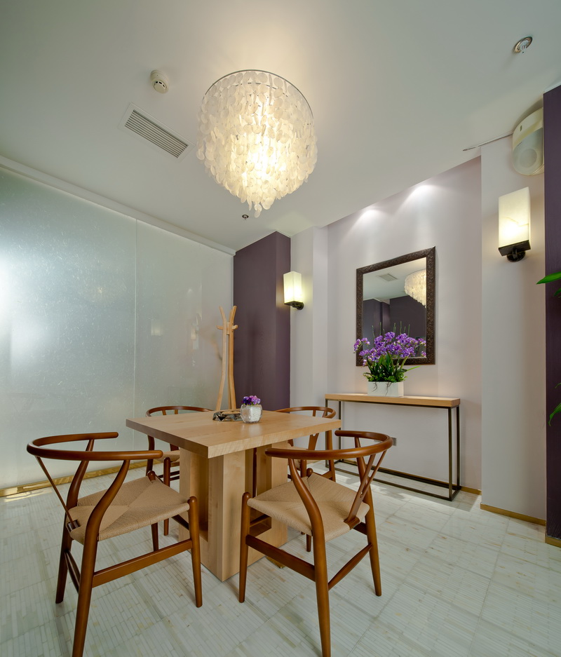 中國古代哲學(xué)思想中講陰陽生萬物,將這種哲學(xué)思想運(yùn)用于空間設(shè)計(jì)與選材,形成了一種“虛與實(shí)、動(dòng)與靜、冷與暖、軟與硬”矛盾統(tǒng)一的關(guān)系,達(dá)到了不同材料之間相互輝映、相輔相成的效果。而這一切都以匣套空間結(jié)構(gòu)理論為空間構(gòu)成依據(jù)展開,大繁即簡,簡而富于變化,整個(gè)空間格局在情理之中,又在意料之外,妙不可言。