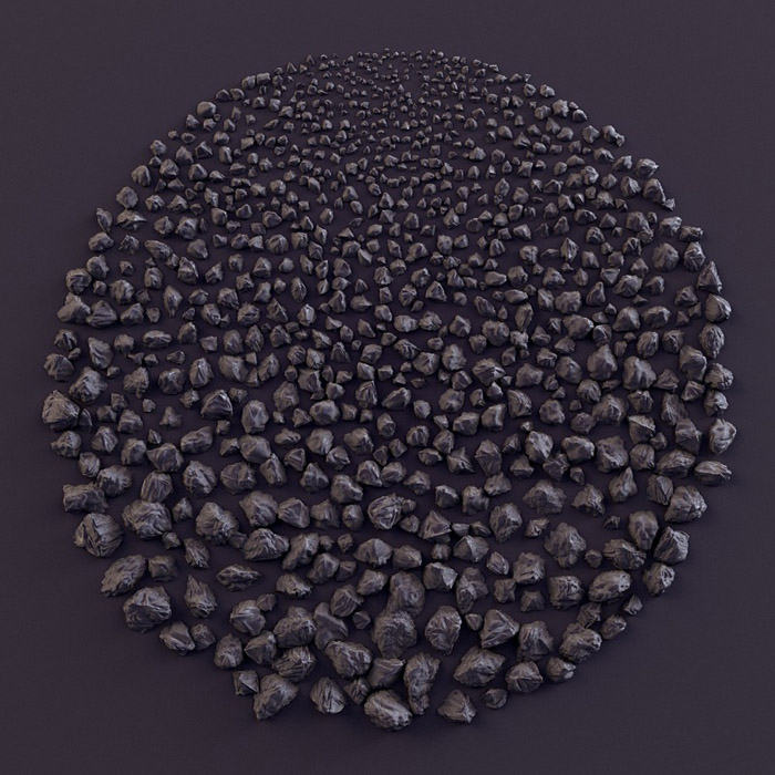 用細分策略將這些虛擬石頭在圓圈中排布到適合位置,用混合代碼驅(qū)動以促成石塊的大小與密度。這是一個C++代碼,輸出的是OBJ3d文件。最后的渲染,其目的不是讓這些石塊看起來有多真實,而是讓他們具有一個穩(wěn)定的色彩,介于真實與抽象之間。