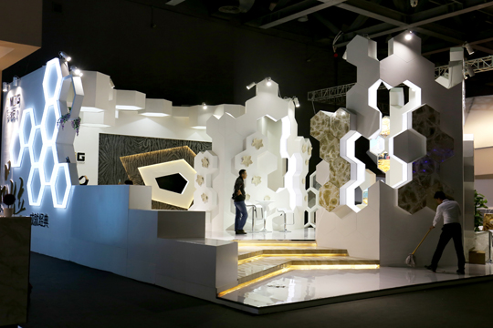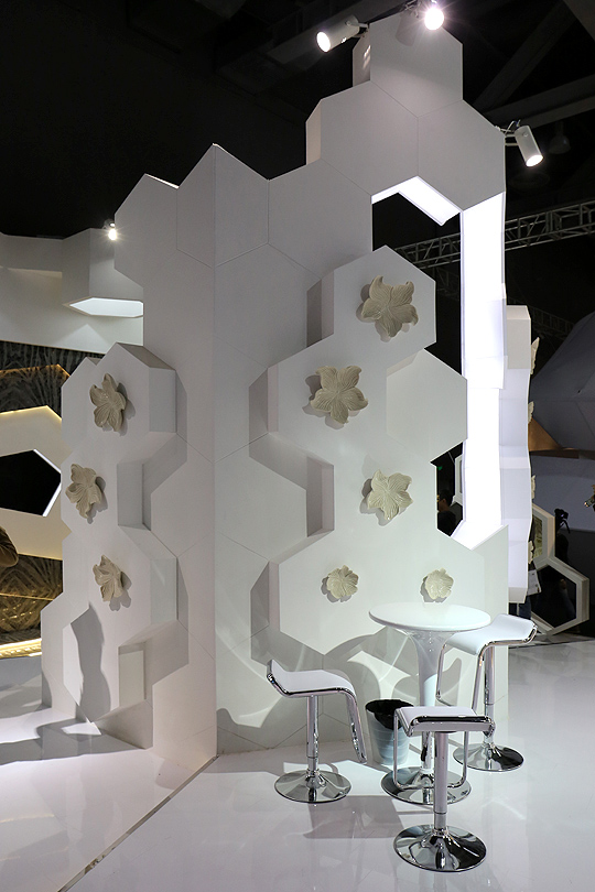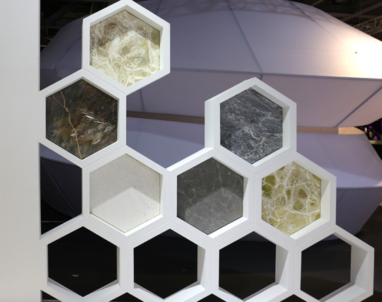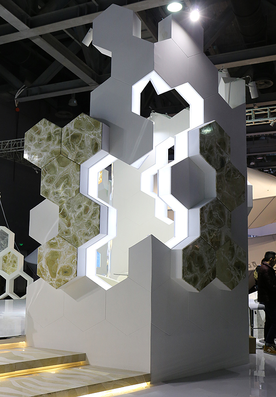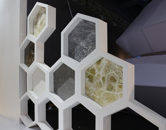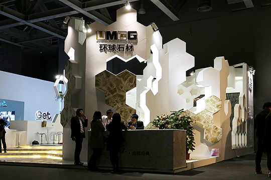本次展位來(lái)自蜂巢的靈感,無(wú)數(shù)的石材品種如同蜂群般匯集一體,構(gòu)建一個(gè)豐富、堅(jiān)固、獨(dú)特的天然正六邊形結(jié)構(gòu),一如團(tuán)結(jié)、勤勞的環(huán)球人,和他們認(rèn)真高效的工作態(tài)度。