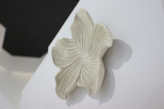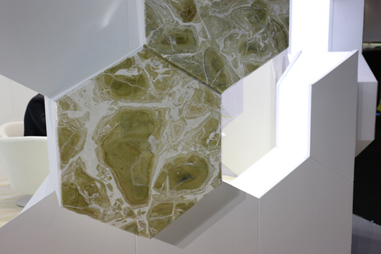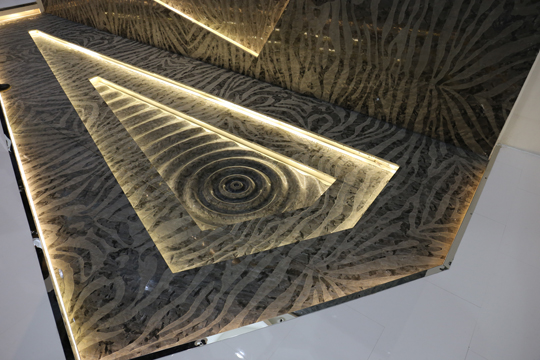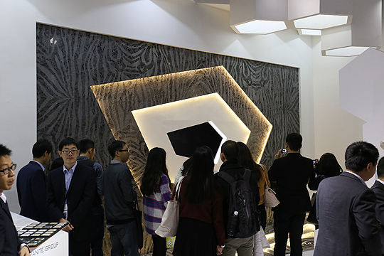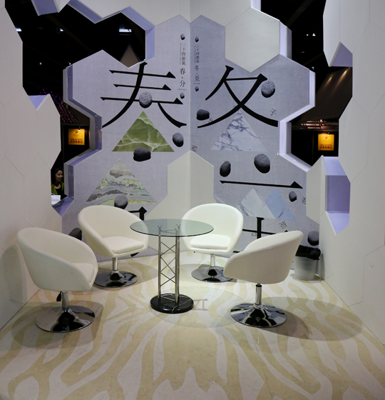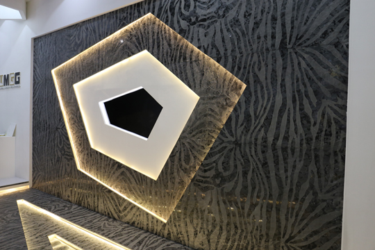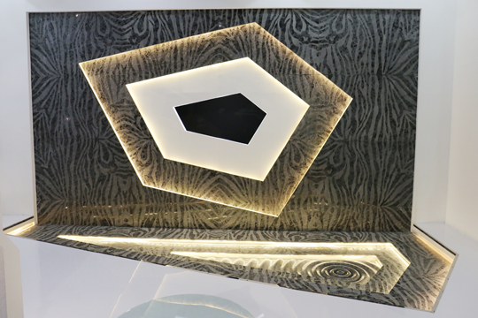 本次展出的主打展品由天然石材墨趣為原料,采用自然切割的表面,略微打磨,能夠展現(xiàn)墨趣本身所富有的細(xì)小晶體和如同毛筆點(diǎn)綴的不規(guī)則斑點(diǎn),通過(guò)燈光照射可折射出細(xì)密繁星般的點(diǎn)光;在表面處理上,采用了獨(dú)特的噴砂面花紋處理——利用帶棱角的金剛砂、石英砂、河砂等磨料在壓縮空氣的帶動(dòng)下對(duì)其表面進(jìn)行沖擊,使部分紋路呈現(xiàn)出細(xì)膩的磨砂質(zhì)感,并設(shè)計(jì)出追紋效果,使幾塊不規(guī)則板材連為一體;在造型上,設(shè)計(jì)師采用美學(xué)幾何圖形的直線切割,將墨趣設(shè)計(jì)成不規(guī)整的五邊形層疊,配上地面模擬水面反光效果,形成一幅獨(dú)特的藝術(shù)作品。