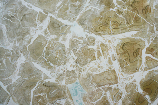 在展廳外墻展示的為近期主打天然石材品種——碧水閑云,像是在碧綠的湖面上倒影著天邊雜亂的云彩,寓意著春天的到來(lái)。