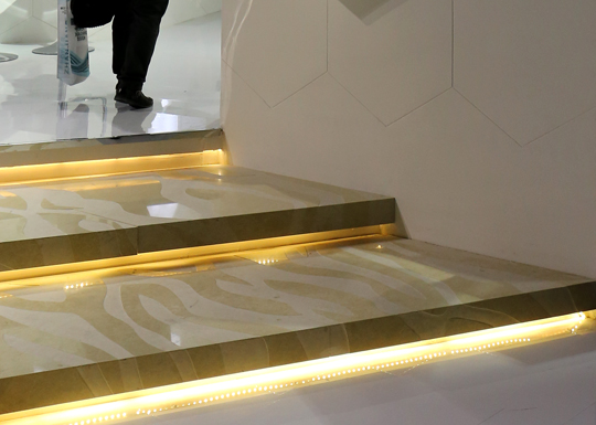 值得一提的是,本次展出中,我們還特地加入了人造石產(chǎn)品,比如入口的臺(tái)階和休息區(qū)的地面,皆采用人造石(多納米黃)進(jìn)行表面部分噴砂處理,利用追紋設(shè)計(jì),打造不一樣的視覺(jué)感受。