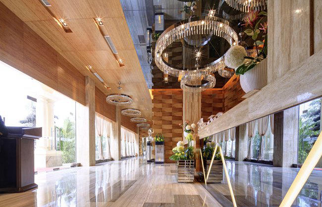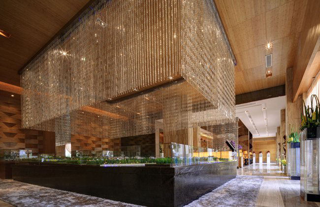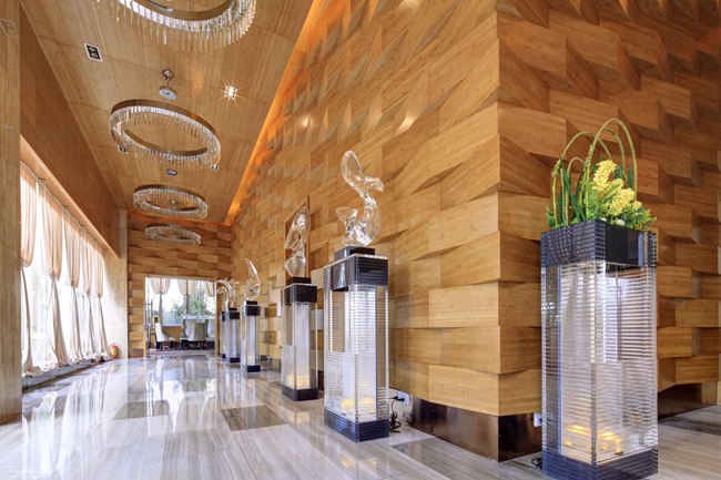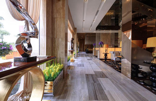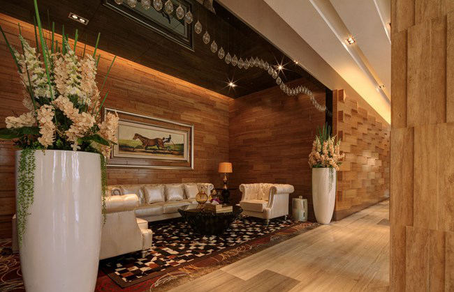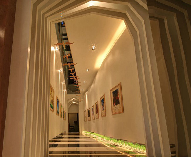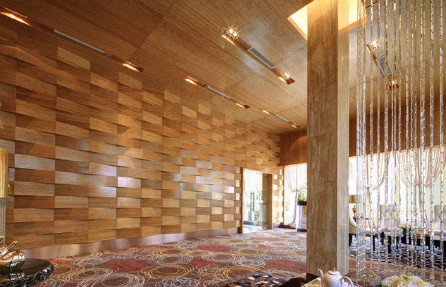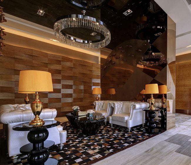 本案把強烈的體塊感與靈動的平面流線相互配合,營造出恢弘大氣的現(xiàn)代售樓展示空間。設計師在空間布局上一氣呵成,巧妙地把建筑空間的狹窄感轉(zhuǎn)化為特色,以一種鮮明的流線形式,配合墻身橫向的折狀造型,加強了售樓部的視覺動感。在燈光的配合下,塊狀的立面形成獨特的光影效果。木皮飾面讓人倍感親切,配以相同色調(diào)的黃洞石和木紋石,使得空間整體顏色協(xié)調(diào)而統(tǒng)一。會客區(qū)以紅銅作為主要材料,提升了設計的品位;以灰鏡作為天花,可以消除空間的狹窄感,產(chǎn)生錯落有致的視覺效果。